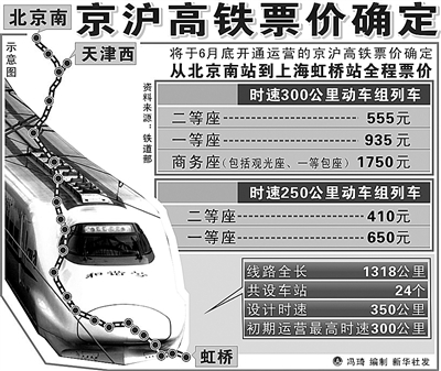 具体票价为:时速300公里动车组列车从北京南站到上海虹桥站全程票价二等座555元、一等座935元、商务座(包括观光座、一等包座)1750元;时速250公里动车组列车全程票价二等座410元、一等座650元。京沪高铁开通运营后,京沪高铁公司将根据市场需求变化,在运价政策范围内,对动车组列车实行票价浮动政策,让广大旅客获得更多实惠。