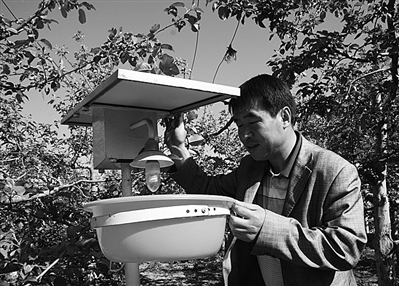中图 旬邑县果业服务中心技术员周永博,详细观察太阳能杀虫灯使用效果。