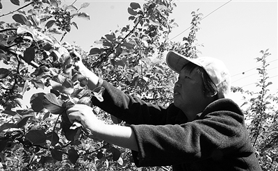 下图 旬邑县丈八寺镇苏村的梁妞润,在农业部苹果标准园按照技术规范疏果。