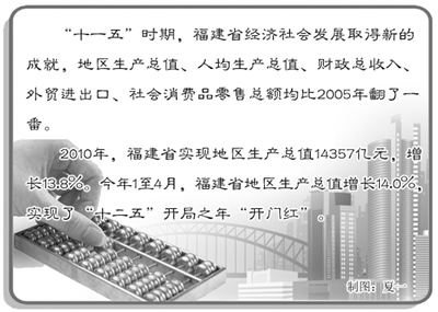 国务院《关于支持福建省加快建设海峡西岸经济区的若干意见》颁布两年来,福建省经济社会取得了长足的发展。2010年1月,福建省委、省政府部署大干150天,推动重点项目建设、新增长区域发展、城市建设、小城镇改革发展、民生工程,迅速掀起比学赶超的热潮。经过上下共同努力,福建顺利完成了“十一五”规划确定的目标任务。“十一五”时期,福建省经济社会发展取得新的成就,地区生产总值、人均生产总值、财政总收入、外贸进出口、社会消费品零售总额均比2005年翻了一番。2010年,福建省实现地区生产总值14357亿元,增长13.8%。今年1至4月,福建省地区生产总值增长14.0%,实现了“十二五”开局之年开门红。