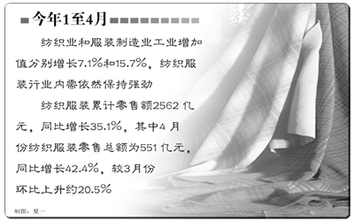 有关数据显示,今年1至4月纺织业和服装制造业工业增加值分别增长7.1%和15.7%,纺织服装行业内需依然保持强劲,今年1至4月纺织服装累计零售额2562亿元,同比增长35.1%,其中4月份纺织服装零售总额为551亿元,同比增长42.4%,较3月份环比上升约20.5%。