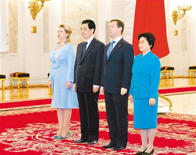 当天下午,胡锦涛和夫人出席梅德韦杰夫和夫人举行的欢迎宴会。随后,梅德韦杰夫和胡锦涛先后在《中俄睦邻友好合作条约》签署10周年庆祝音乐会上致辞(致辞全文见2版)。当晚,胡锦涛和夫人出席梅德韦杰夫和夫人举行的家宴。
