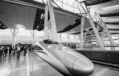 6月17日,高铁列车停靠在北京南站站台准备发车。 当天,铁道部组织近百名记者搭乘京沪高铁,体验北京至上海的旅程。京沪高铁起自北京南站,终至上海虹桥站,全长1318公里,设计时速350公里,初期运营最高时速300公里。据介绍,京沪高铁将于6月底开通运行。运营初期,计划每天安排开行动车组列车90对,实行时速300公里和250公里混跑模式。 本报记者 赵 晶 亢 舒摄影报