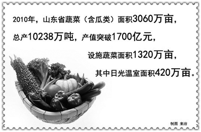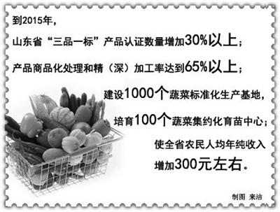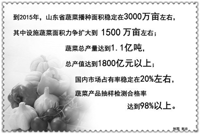 “‘十二五’期间,蔬菜播种面积稳定在3000万亩左右,其中设施蔬菜面积力争扩大到1500万亩左右;蔬菜总产量达到1.1亿吨,总产值达到1800亿元以上。”山东省的蔬菜产业发展不仅让山东菜农走上致富道路,更探索出一条惠农利民的全产业链发展模式,将为全国的“菜篮子”供应和发展做出新的贡献。