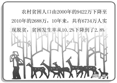 农村贫困人口大幅度下降。农村贫困人口由2000年的9422万下降至2010年的2688万,10年来,共有6734万人实现脱贫,贫困发生率从10.2%下降到了2.8%。同时,592个国家扶贫开发工作重点县农民人均纯收入从2001年的1277元增加到2010年的3273元,年均实际增幅略高于全国平均增长水平。