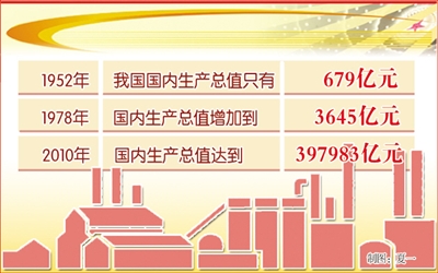 1952年,我国国内生产总值只有679亿元,到1978年增加到3645亿元,在改革开放的历史新时期,经济总量迅猛扩大,2010年达到了397983亿元,1979年至2010年年平均增长9.9%。2010年一天创造的财富量远远超过了1952年一年的总量。