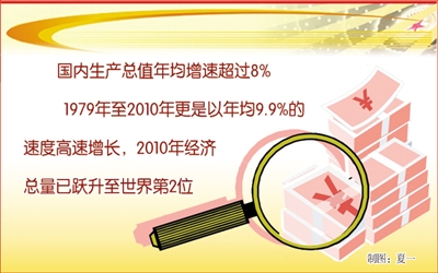 国内生产总值年均增速超过8%,1979年至2010年更是以年均9.9%的速度高速增长,2010年经济总量已跃升世界第2位。