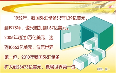 1952年,我国外汇储备只有1.39亿美元,到1978年,也只增加到1.67亿美元。随着对外开放的推进,外汇储备逐步由短缺走向富裕,1990年外汇储备超过百亿美元,达到111亿美元,1996年超过千亿美元,达到1050亿美元,2006年超过1万亿美元,达到10663亿美元,位居世界第一位,2010年我国外汇储备扩大到28473亿美元,稳居世界第一位。