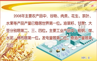 2008年主要农产品中,谷物、肉类、花生、茶叶、水果等产品产量已稳居世界第一位。油菜籽、甘蔗、大豆分别居第二、三、四位。主要工业产品中,粗钢、煤、水泥、棉布居第一位。发电量居第二位。原油产量居第五位。其他主要产品产量的位次也明显前移。