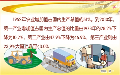 1952年农业增加值占国内生产总值的51%。到2010年,第一产业增加值占国内生产总值的比重由1978年的28.2%下降为10.2%,第二产业由47.9%下降为46.9%,第三产业则由23.9%大幅上升至43.0%。
