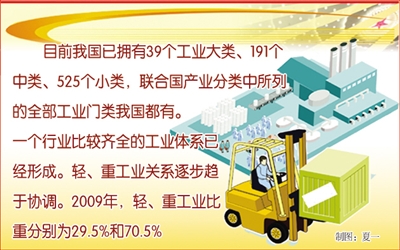 目前我国已拥有39个工业大类、191个中类、525个小类,联合国产业分类中所列的全部工业门类我国都有。一个行业比较齐全的工业体系已经形成。轻、重工业关系逐步趋于协调。2009年,轻、重工业比重分别为29.5%和70.5%。