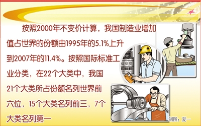 新中国成立以前,我国只能制造初级工业品,新中国成立以来,随着工业基础建设的加强,生产能力的不断扩张,我国已经逐步发展成为世界制造业大国。根据联合国工发组织资料,按照2000年不变价计算,我国制造业增加值占世界的份额由1995年的5.1%上升到2007年的11.4%。按照国际标准工业分类,在22个大类中,我国21个大类所占份额名列世界前六位,15个大类名列前三,7个大类名列第一。