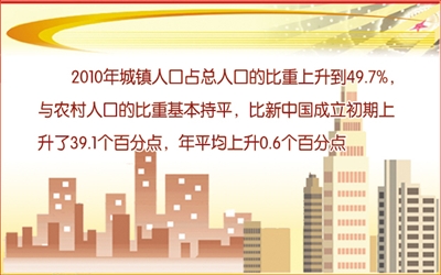 新中国成立以前,我国城镇化水平很低。1949年城镇人口占总人口的比重仅为10.6%。第六次全国人口普查数据显示,2010年城镇人口占总人口的比重上升到49.7%,与农村人口的比重基本持平,比新中国成立初期上升了39.1个百分点,年平均上升0.6个百分点。新农村建设稳步推进,城乡经济社会发展一体化的新格局正在逐步形成。