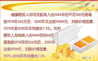 城镇居民人均可支配收入由1949年的不足100元提高到1978年343元后,2010年又达到19109元,扣除价格因素,1979年至2010年年均增长7.3%。农村居民人均纯收入由1949年的44元提高到1978年的134元后,2010年达到5919元,扣除价格因素,1979年至2010年年均增长7.3%。收入的增加使城乡居民拥有的财富呈现快速增长趋势。股票、债券等金融资产规模不断扩大。城镇居民拥有的财产性收入占全部收入的比重由无到有,上升到2010年的2.5%。