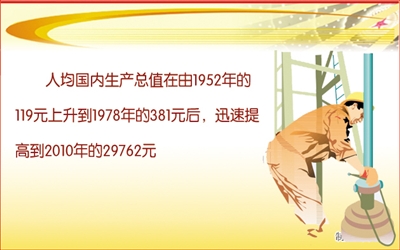 人均国内生产总值在由1952年的119元上升到1978年的381元后,迅速提高到2010年的29762元。对于我国这样一个经济发展起点低、人口基数庞大的国家,在60多年后能够取得这样的进步,是一个了不起的成绩。