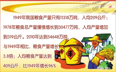 1949年我国粮食产量只有11318万吨,人均209公斤;1978年粮食总产量缓慢增长到30477万吨,人均产量增加到319公斤。改革开放以后,国家对农业的强力支持和农业科技的进步使粮食产量进入快速增长期,1984年超过4亿吨,1996年超过5亿吨,2010年达到54648万吨,与1949年相比,粮食产量增长3.8倍;人均粮食产量达到409公斤,比1949年增长96%。