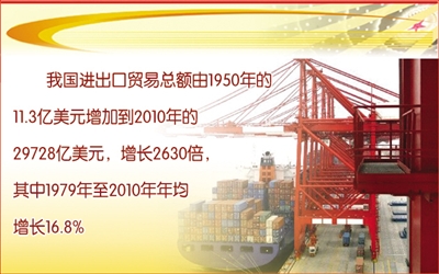 新中国成立以来,我国进出口贸易总额由1950年的11.3亿美元增加到2010年的29728亿美元,增长2630倍,其中1979年至2010年年均增长16.8%。进出口贸易总额居世界位次由1978年的第29位跃升到2009年的第2位,占世界贸易总额的比重也由0.8%提高到8.8%。其中,出口总额跃居世界第1位,进口总额升至世界第2位。