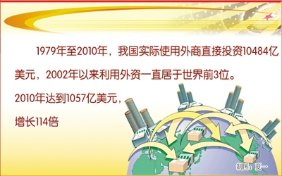 新中国成立以前,我国利用外资渠道单一,规模很小。新中国成立以来,特别是改革开放以来,利用外资在近乎空白的基础上迅速发展。1979年至2010年,我国实际使用外商直接投资10484亿美元,2002年以来利用外资一直居于世界前3位。1983年,我国实际使用外商直接投资9.2亿美元,2010年达到1057亿美元,增长114倍,利用外资规模已经跃居世界第2位。