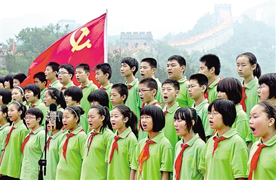 图1:6月20日,少先队员代表在长城上合唱《没有共产党就没有新中国》。当日,“放歌长城献给党”——庆祝建党90周年大型演唱会在北京八达岭长城举行。