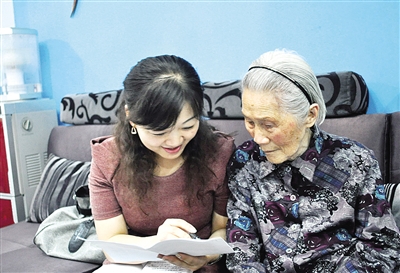 图4:光明日报记者在福州采访老教师黄以雍(右),听她讲述教育事业的喜人变化。