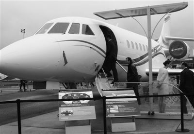 第49届巴黎国际航空航天展20日在巴黎布尔歇国际展览中心开幕,为期7天的展览吸引了2000多家企业参展。图为参观者在参观达索猎鹰公司展出的商务飞机。 本报记者 李红光摄
