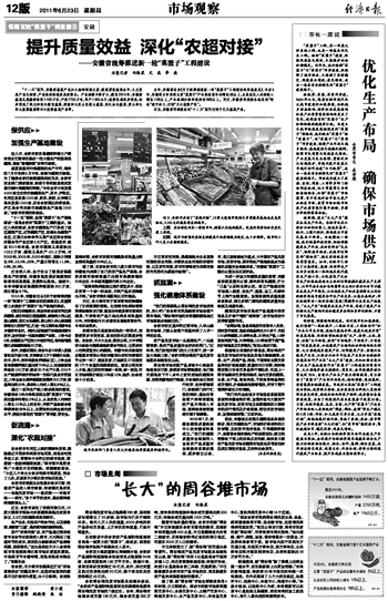 据了解,目前合肥市的几家大超市均在安徽省内选择了自己的农产品生产基地,合肥农超对接销售量已达超市果蔬销售的20%左右,今年底有望提升到30%左右。