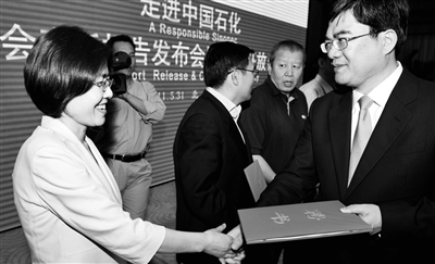 图2: “走进中国石化——社会责任报告发布会暨公众开放日活动”近日举行,图为企业负责人向社会监督员(左)颁发聘书。新华社记者鲁 鹏摄