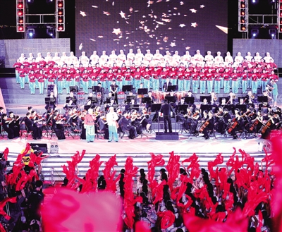 6月22日晚,庆祝中国共产党成立90周年省会群众歌咏大会在长沙橘子洲公园上演。当地3000余名干部群众一同歌唱红歌,向党的生日献礼。 新华社记者 龙弘涛摄