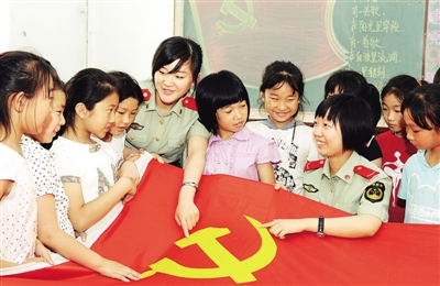 图① 6月22日,秦皇岛边防检查站的战士孙旻(前右)和战友柳施宇在给河北省秦皇岛市东山小学的孩子们讲解党旗知识。