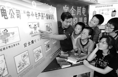 6月19日,河北省武强县供电公司员工向当地学校的学生讲解安全用电常识。当天,该公司开展“安全用电进校园”活动,通过宣传漫画、实物演示、发放手册等形式宣传用电常识,增强同学们安全用电和节能节电的意识。 本报记者 赵 晶摄