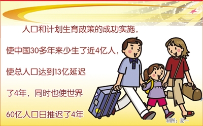 上世纪70年代后期,我国开始实行人口和计划生育政策,并在80年代将这一政策上升为基本国策,30多年来,它的成功实施使中国少生了近4亿人,使总人口达到13亿延迟了4年,从根本上改变了中国人口发展的历史轨迹,同时也使世界60亿人口日推迟了4年。中国是发展中的人口大国在上世纪惟一达到低生育水平的国家,并将比其他发展中国家提早半个世纪实现人口零增长,对世界人口与发展做出了积极贡献。