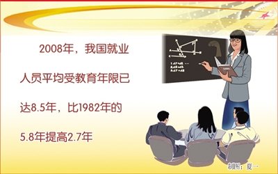 新中国成立前,我国的文化教育十分落后,劳动者普遍处在文盲半文盲状态,接受过高等教育的人更是凤毛麟角。新中国成立后特别是改革开放以来,我国的教育事业进一步发展,加之市场竞争就业机制的逐步形成,劳动者为了增强自己在劳动力市场上的竞争力,更加注重自身素质的提高,我国就业人员整体素质有了明显提高。2008年,我国就业人员平均受教育年限已达8.5年,比1982年的5.8年提高了2.7年。在全部就业人员中,大专及以上文化程度者所占比重由1982年的0.9%上升到2009年的7.4%;高中文化程度的由10.5%上升到2009年的12.8%;初中文化程度的由26%上升到2009年的48.7%%。