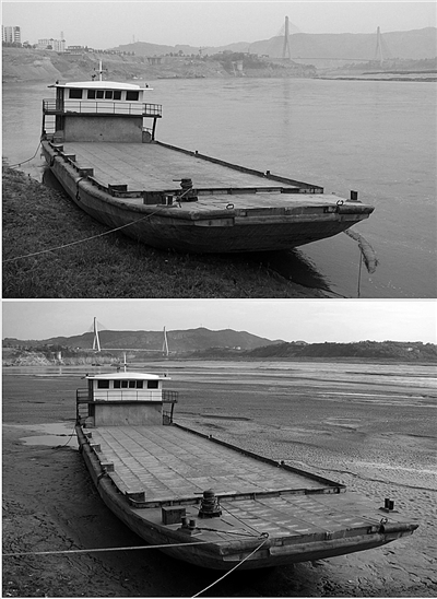 下图 由于前些天出现的局地降雨天气,汉江湖北段水位由5月15日的136.78米升至138.61米,小型船只已经能在江上通行。这张拼版照片显示的是:左上图,6月4日,停靠在湖北省十堰市郧县境内汉江段江边的货船;左下图,5月15日,郧县境内汉江段受持续干旱的影响,大面积河床裸露,导致货船搁浅。