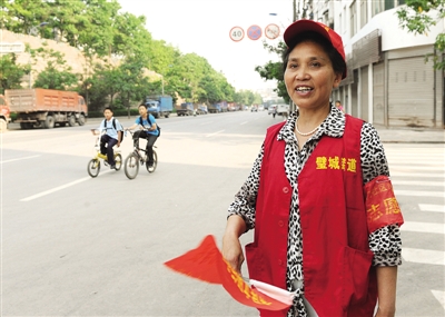 上图 周尚菊在劝导行人走人行横道(6月8日摄)。
