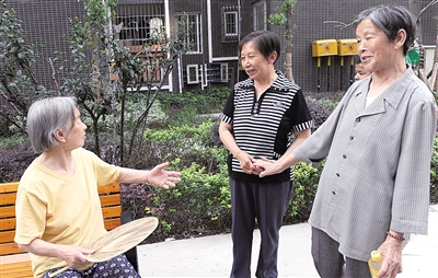 右图 廖全国(中)与邻居们聊天(6月8日摄)。