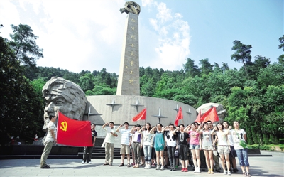 6月25日,重庆一家公司的60余名党员,在贵州遵义的红军山烈士陵园纪念碑前重温入党誓词。整个陵园庄严肃穆,正面是在纪念遵义会议50周年时兴建的纪念碑,碑上有“红军烈士永垂不朽”8个金色大字。每年“七一”前后,全国各地前来瞻仰、重温入党誓词的游客络绎不绝。新华社记者 欧东衢摄