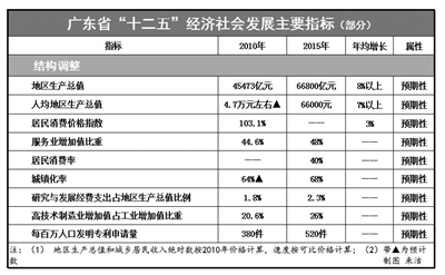 广东省“十二五”规划纲要同时勾画了广东未来5年发展图景:到2015年,全省人均生产总值提前5年实现比2000年翻两番目标,经济发展方式转变取得显著进展,社会软实力显著提升,民生福祉显著改善,科学发展的体制机制日益完善。全省生产总值年均增长8%以上,到2015年约6.7万亿元。人均生产总值年均增长7%以上,到2015年约6.6万元。