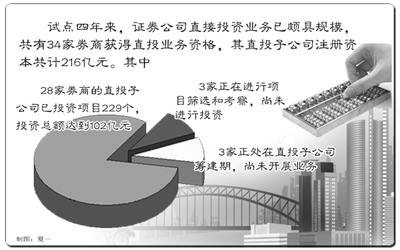 日前,由中国证券业协会主办的证券公司直接投资业务座谈会在北京召开,来自协会的统计数据显示,试点四年来,证券公司直接投资业务已颇具规模,共有34家券商获得直投业务资格,其直投子公司注册资本共计216亿元。其中,28家券商的直投子公司已投资项目229个,投资总额达到102亿元,所投项目中有29个已经上市。此外,已获得直投资质的券商中有3家正在进行项目筛选和考察,尚未进行投资;有3家正处在直投子公司筹建期,尚未开展业务。