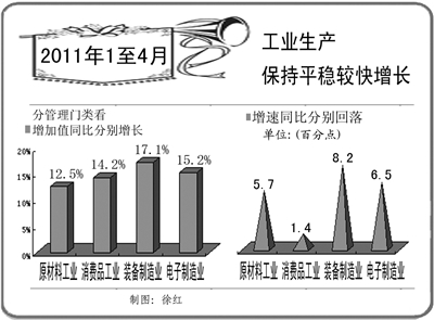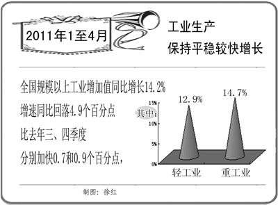 2011年1至4月,我国规模以上工业增加值同比增长14.2%,增速同比回落4.9个百分点,比去年三、四季度分别加快0.7和0.9个百分点,其中轻、重工业增加值同比分别增长12.9%和14.7%。