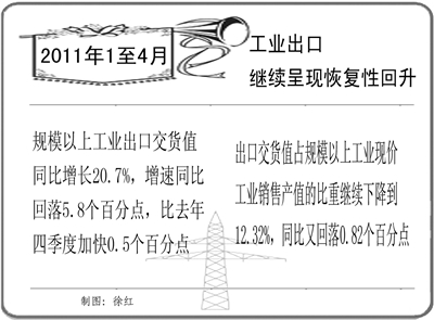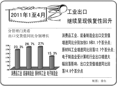 出口继续呈现恢复性回升。2011年1至4月,规模以上工业出口交货值同比增长20.7%,增速同比回落5.8个百分点,比去年四季度加快0.5个百分点;出口交货值占规模以上工业现价工业销售产值的比重继续下降到12.32%,同比又回落0.82个百分点。分管理门类看,消费品工业、装备制造业出口交货值同比分别增长23.3%和26.7%,增速同比分别加快3.9和1.1个百分点;原材料工业出口交货值增长27%,同比回落12.7个百分点;电子制造业受计算机行业出口增速大幅回落影响,出口交货值同比仅增长15.3%,增速同比回落14.8个百分点。