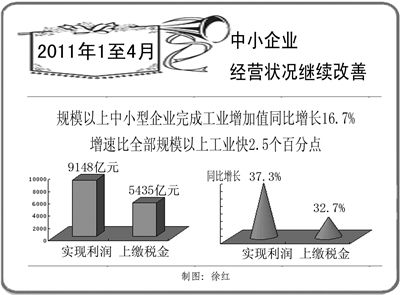 报告显示,我国中小企业经营状况继续改善。2011年1至4月,规模以上中小型企业完成工业增加值同比增长16.7%,增速比全部规模以上工业快2.5个百分点。实现利润9148亿元,同比增长37.3%。
