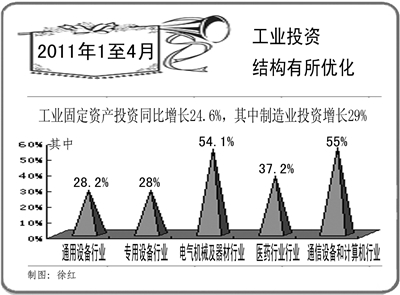 工业投资结构有所优化。2011年1至4月,工业固定资产投资同比增长24.6%,其中制造业投资增长29%。在宏观调控和市场因素双重作用下,六大高耗能行业投资同比增长13.7%,增幅较去年全年增速下降1.1个百分点,低于同期工业投资平均水平10.9个百分点。装备制造业、高技术产业投资保持了较快增长。