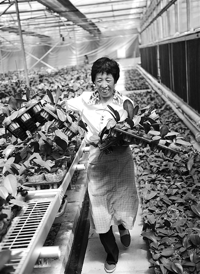 在河北省冀州市蝴蝶兰花卉生产基地,工人正在搬运蝴蝶兰。冀州市将把蝴蝶兰产业作为调整种植结构、新兴致富产业,力争用3至5年时间建成辐射全国的蝴蝶兰专业产销基地。 新华社记者 王 民摄