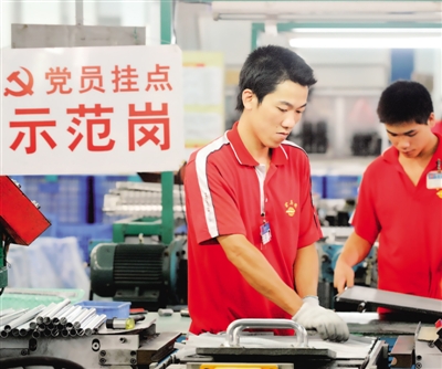 左图 党员旁仍想(左)在宝马利公司生产车间的“党员挂点示范岗”作业(6月13日摄)。走进宝马利公司的生产车间,在党员示范岗、党员挂点联系岗上,亮证上岗的党员是一道独特的风景。 新华社记者 刘大伟摄