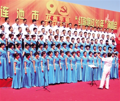 左图 6月26日上午,黑龙江五大连池市讷谟尔河畔广场红旗招展、歌声飞扬。戴着军功章的老红军、老抗联、老志愿军战士、老干部和青少年学生们欢聚在一起,共同庆祝建党90周年。“红歌飘过90年”歌咏比赛中,1000余名党员干部和万名群众唱响了激昂的旋律;“奖先优、唱红歌、念党恩”活动,则对先进基层党组织、优秀共产党员、优秀党务工作者等进行了表彰。 本报