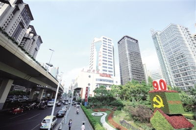 | 上图 上海市长宁区公路旁,庆祝中国共产党成立90周年的花坛格外醒目。截至去年底,上海已先后建成了4座航站楼、5条跑道;沪宁城际铁路、沪杭客运专线建成通车,形成“3主3辅”共6个客运站格局;轨道交通形成12条线、运营线路总长452.6公里的基本网络,在世界大城市中名列前茅。 |