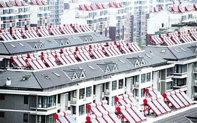 | 左图 河北秦皇岛市山海关观山海居民小区,家家户户统一安装了太阳能热水器。秦皇岛市优化能源结构,大力提倡低碳生产、消费和生活方式,积极探索和实践低碳发展之路,通过完善市区天然气管网,开发风能、太阳能等新能源,示范和推广成功经验,正努力建设绿色生态城市。 |