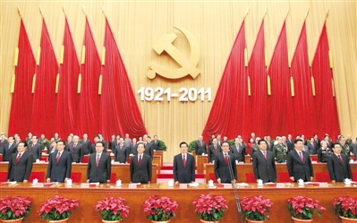 鲜花竞艳,灯火璀璨,人民大会堂大礼堂内气氛庄重而热烈。主席台上方悬挂着“庆祝中国共产党成立90周年大会”会标,帷幕正中是熠熠生辉的中国共产党党徽。二楼眺台上悬挂着横幅:“紧密团结在以胡锦涛同志为总书记的党中央周围,高举中国特色社会主义伟大旗帜,为夺取全面建设小康社会新胜利、开创中国特色社会主义事业新局面、实现中华民族伟大复兴而不懈奋斗!”