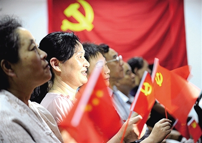 7月1日上午9点半,有着40年党龄的张素芳走进了湖北省武汉市万松街武展社区服务中心,这间30多平方米的服务中心已经坐满了人。居民代表、打工者、学生等齐聚一堂,准备收看庆祝中国共产党成立90周年大会电视直播。液晶电视上方,鲜红的入党誓词格外引人注目。