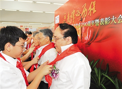 6月26日,广东电网公司隆重召开纪念中国共产党成立90周年暨表彰大会。有着52年党龄的中国工程院院士罗绍基等10名老党员、老劳模、老同志一起回顾了在党的领导下电力发展的伟大成就。图为少先队员为老党员们戴红领巾。